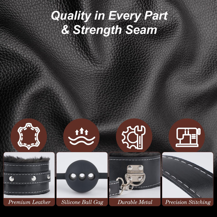 Indeholder silikonegag, manchetter i kunstlæder og forstærkede syninger for sikkerhed, komfort og langvarig brug.